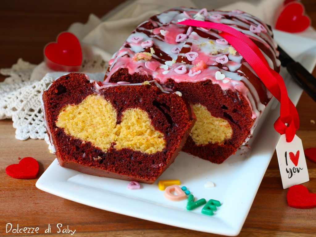 Zodra het biscuit klaar is, laat het goed afkoelen en keer het om op een snijplank of werkblad. Snijd nu met de twee hartvormige koekjesvormen, geplaatst naast elkaar, harten uit over de gehele lengte van het biscuit. Neem de plumcakevorm en giet 2-3 eetlepels rood beslag op de bodem. Plaats nu alle uitgesneden harten over de lengte van de plumcakevorm en giet vervolgens het resterende rode beslag. Bak dan in een hete oven op 180° ongeveer 40 minuten. Zodra je red velvet plumcake gaar is, decoreer met witte en roze glazuur en suikerstrooisels. Eet smakelijk en fijne Valentijnsdag.