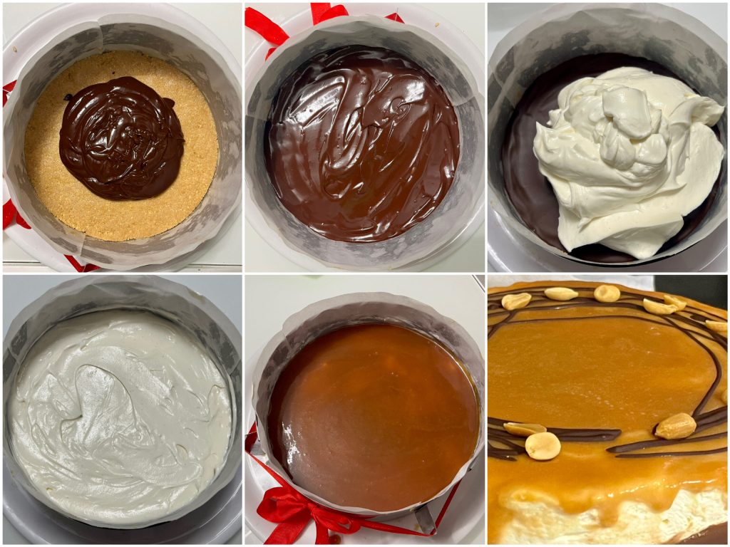 Om deze heerlijke no-bake taart voor te bereiden, begin je met de basis van verkruimelde koekjes, gesmolten boter en gehakte pinda’s, die knapperigheid en een omhullende smaak geven. Je gaat verder met een heerlijke laag pure chocolade ganache, onze roomkaascreme en een rijke laag gezouten karamel.