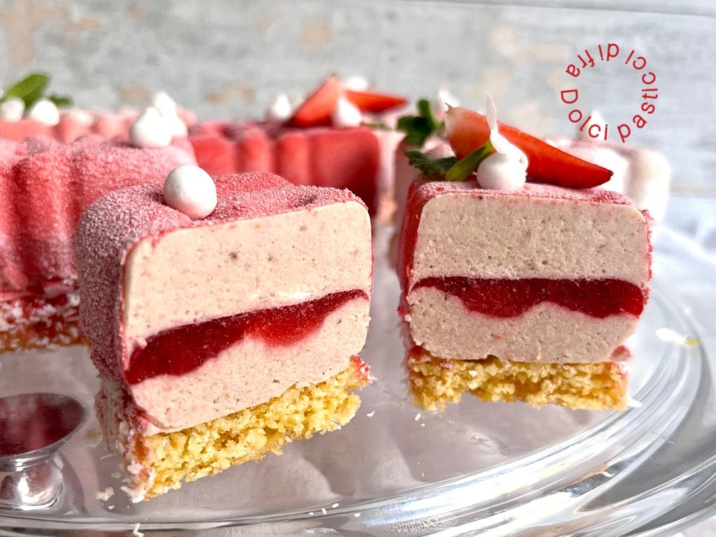De eenpersoonsporties met aardbeien bestaan uit een basis van kokosblondies, bavaroiscrème met aardbeien en een inzetstuk van aardbeiengelee. Aan de buitenkant zijn ze bedekt met een rood en witte fluwelen spray, versierd met verse aardbeien en geraspte kokos.