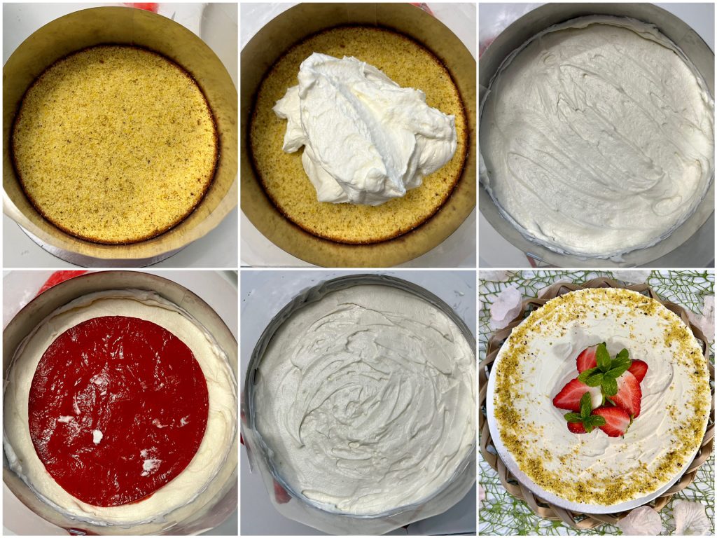Voor de bodem heb ik gekozen voor pistache blondies, gewoon om eens iets anders te proberen, en ik moet zeggen dat het me heel goed beviel! Natuurlijk, als je wilt, kun je kiezen voor de klassieke koekjesbodem en in dit geval kun je pistachemeel toevoegen. We gaan verder met een frisse room op basis van roomkaas, Griekse yoghurt en witte chocolade met binnenin de verrassing van frambozen, een laagje gelei.