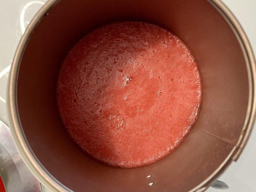 Verwarm een lepel puree om de gelatine erin op te lossen, voeg het toe aan de rest en mix nog een keer kort. Giet nu de gelei in een vorm die iets kleiner is dan de bodem van de cheesecake, ik heb de verstelbare ring van een springvorm van 20 cm gebruikt, bekleed met plasticfolie.
