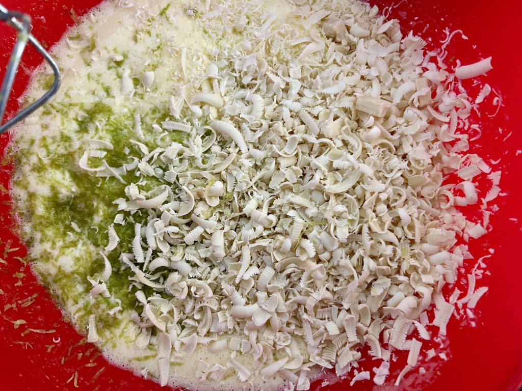 Rasp de witte chocolade met een grove rasp, rasp de schil van de twee citroenen.