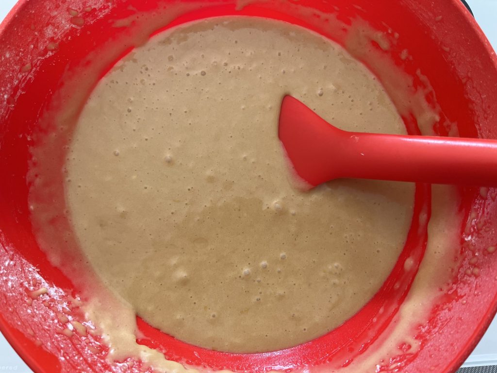 Voeg tenslotte de gezeefde bloem met het bakpoeder toe.