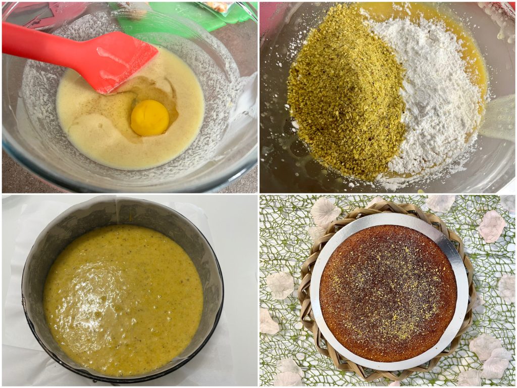 Voeg een voor een de eieren toe aan de gesmolten chocolade en werk ze met een garde, voeg dan de suiker, een snufje zout toe en meng daarna het meel, pistachemeel en bakpoeder.