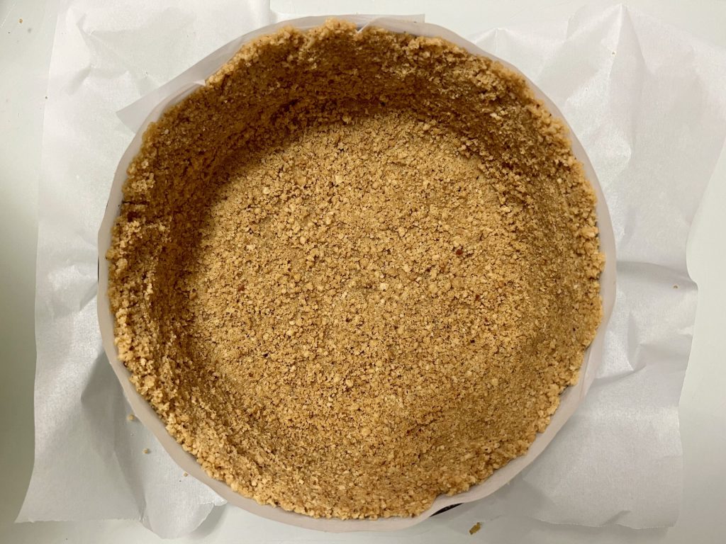 Giet ongeveer de helft van het koekjesmengsel in de vorm en druk goed aan op de bodem, bekleed daarna de hele omtrek.
