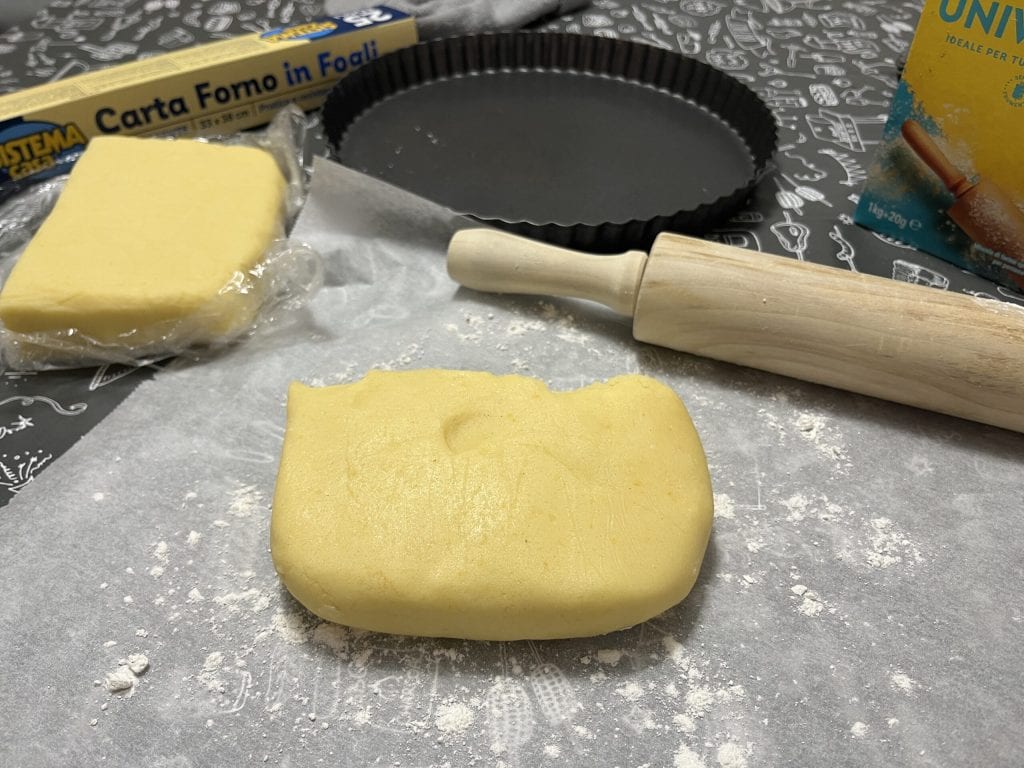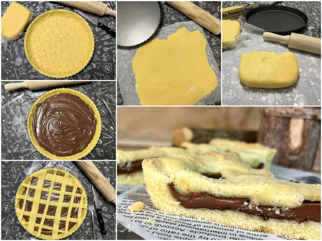 • Prik met een vork gaatjes in de bodem van de taart en vul vervolgens met Nutella. Snijd met het overgebleven deeg lange stroken van dezelfde dikte en decoreer naar wens, til ze voorzichtig op omdat zanddeeg zonder gluten kwetsbaar is en gemakkelijk breekt.
