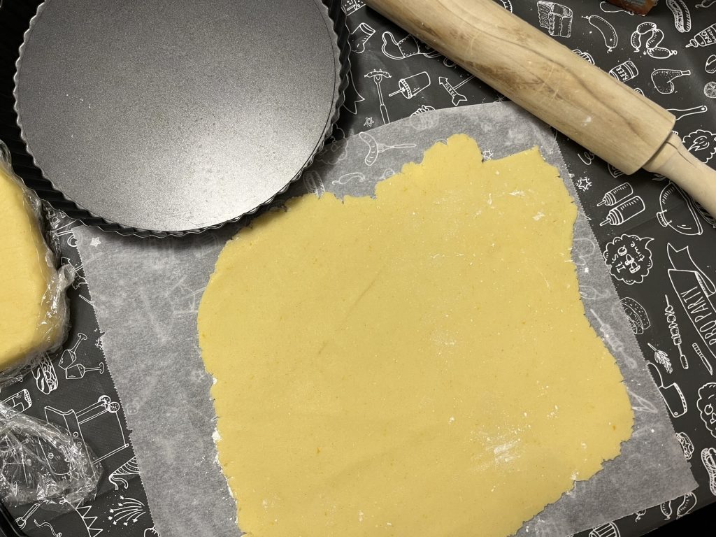 • Na de rusttijd haal je het deeg weer tevoorschijn en rol je het uit op een met bloem bestoven bakpapier, ongeveer 0,5 mm dik.