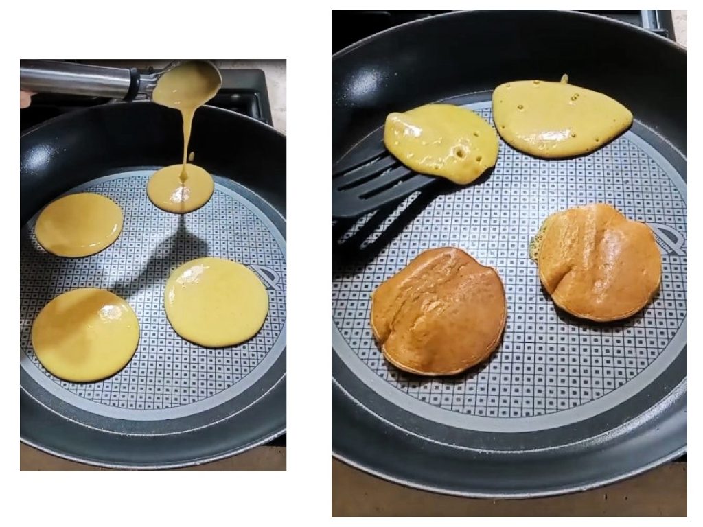 Verwarm een pan, giet een kleine hoeveelheid beslag (ongeveer een halve kop per pannenkoek), wacht 1 minuut en wanneer er belletjes aan de bovenkant verschijnen kun je de pannenkoek omdraaien (houd het vuur laag).
