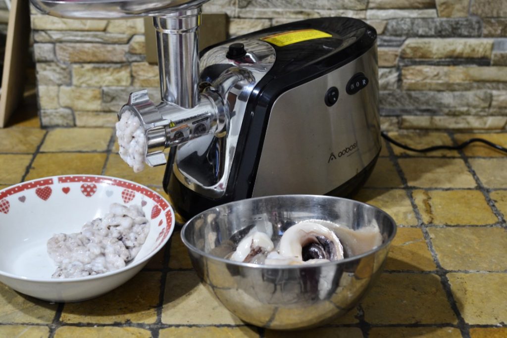 • Spoel de octopus onder stromend water, verwijder vervolgens de bek (hier een gids: hoe een octopus schoonmaken), verdeel hem in grote stukken en maal hem tenslotte door de vleesmolen.