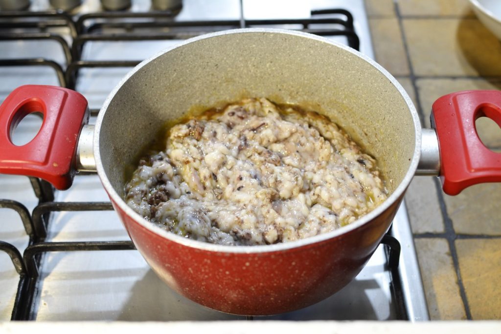 • Laat goed aanbakken, voeg dan 120 ml rode wijn toe. Laat de alcohol verdampen en voeg vervolgens het gemalen octopusvlees toe.