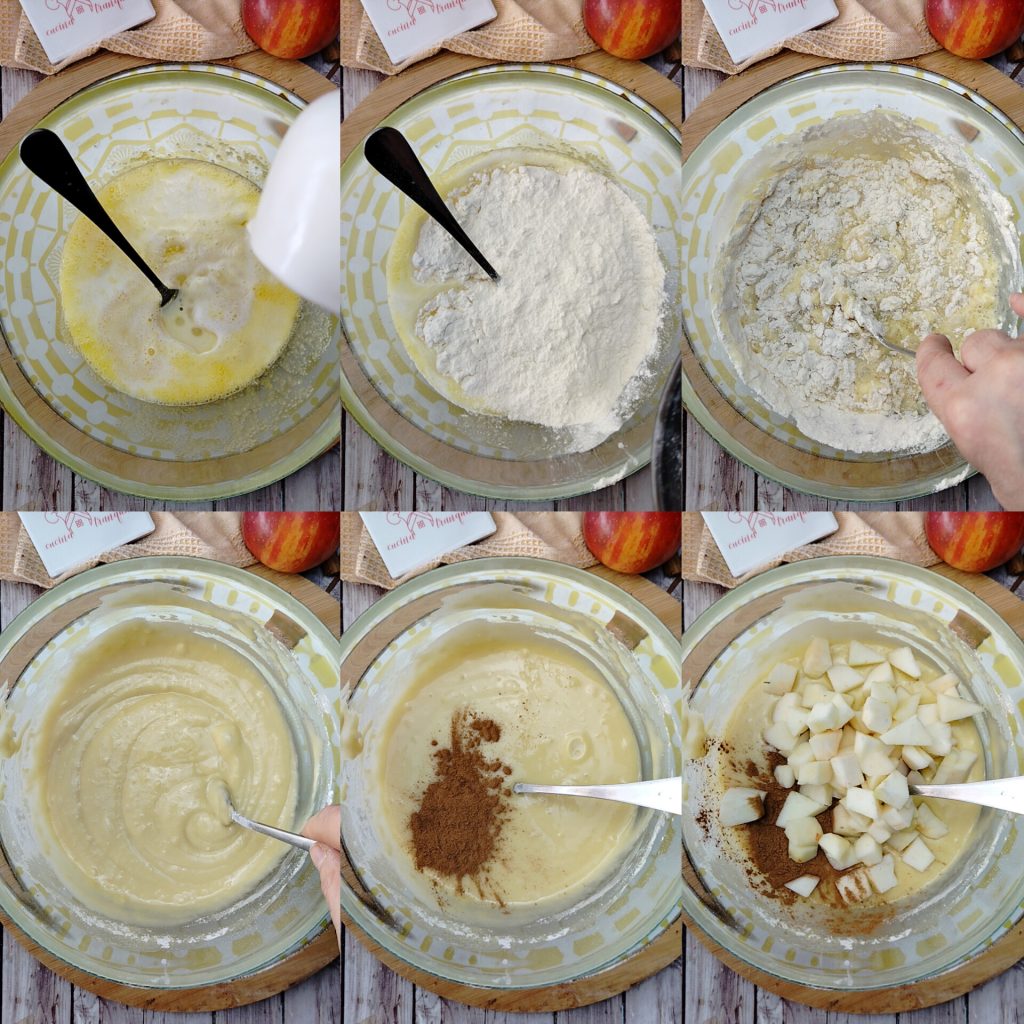 • Voeg daarna de zonnebloemolie en de bloem toe. Roer opnieuw snel met een vork tot je een homogeen mengsel krijgt waaraan je ook de kaneel toevoegt. Voeg twee van de drie appels die in het recept zijn voorzien toe, in blokjes gesneden nadat ze geschild en van het klokhuis ontdaan zijn.