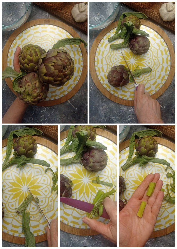 We verwijderen de hardere buitenste bladeren en maken het deel van de steel dat eraan vastzit schoon, en snijden ook een deel van de artisjokkenkap af.