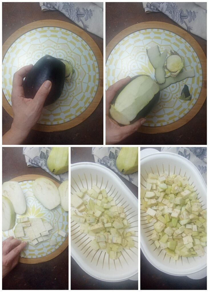 Om de aubergineballetjes in de oven te maken, schillen we eerst de gekozen aubergines en snijden ze eerst in plakjes en vervolgens in blokjes.