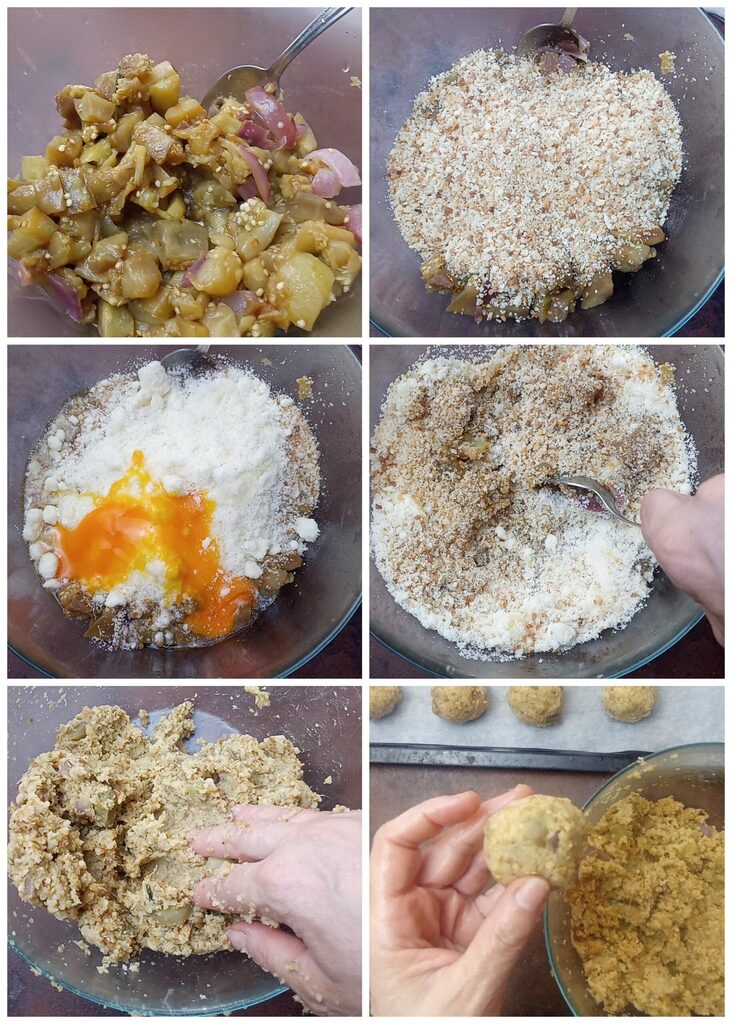 Het is belangrijk om de aubergines goed te laten afkoelen voordat je ze verwerkt en dan, nadat je ze samen met de andere ingrediënten hebt samengesteld, laat je ze ongeveer 30 minuten rusten, zodat het paneermeel alle vloeistoffen goed opneemt.