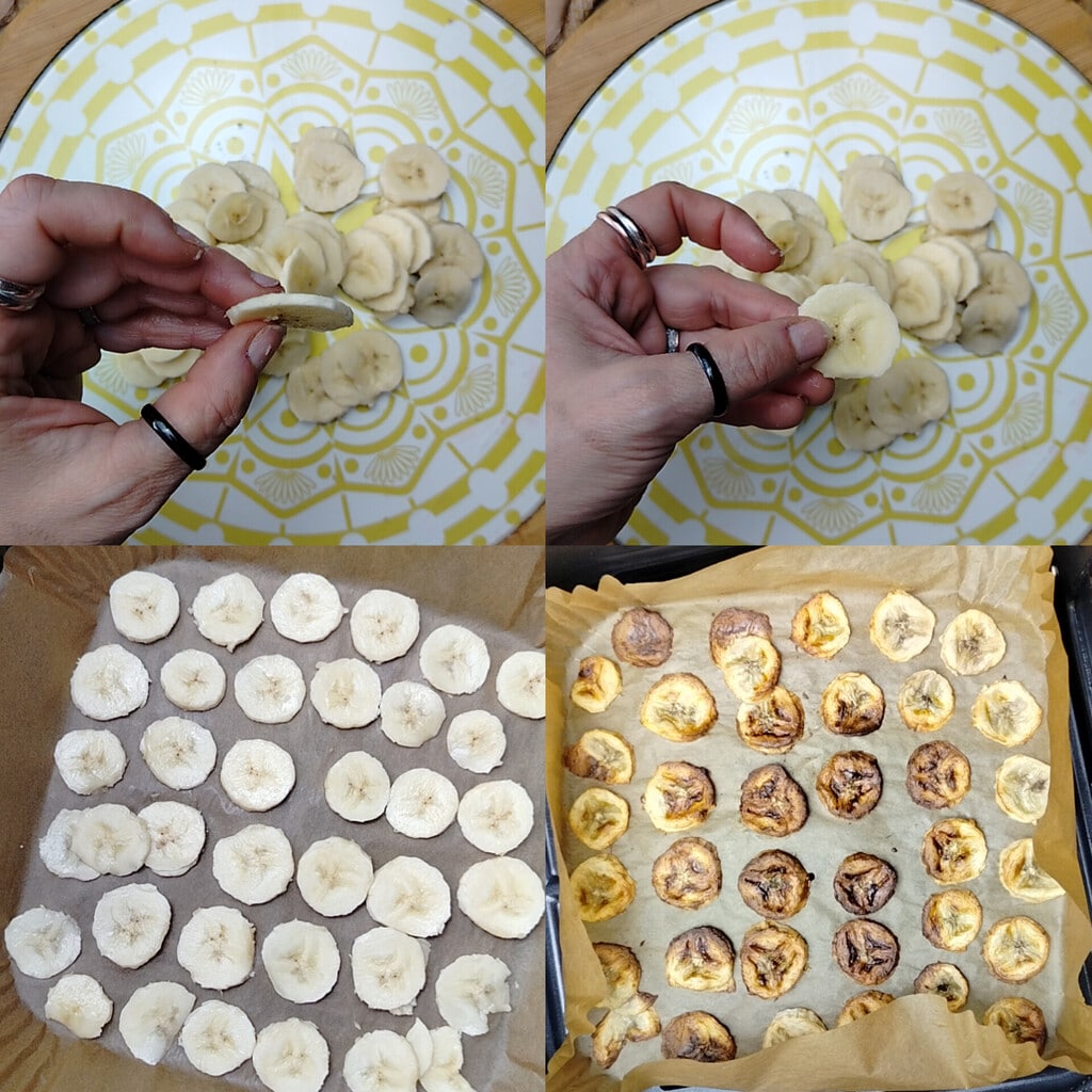 • Om bananenchips in de airfryer te maken, pel je eerst een niet te rijpe banaan, verwijder je de draden en snijd je deze in plakjes van ongeveer 3 millimeter dik.
