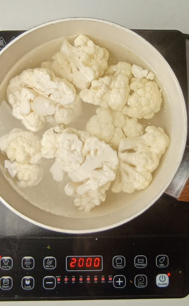 Snijd ze in plakjes en voeg ze na 5 minuten koken van de bloemkool toe aan de pan en kook alles nog 15 minuten.