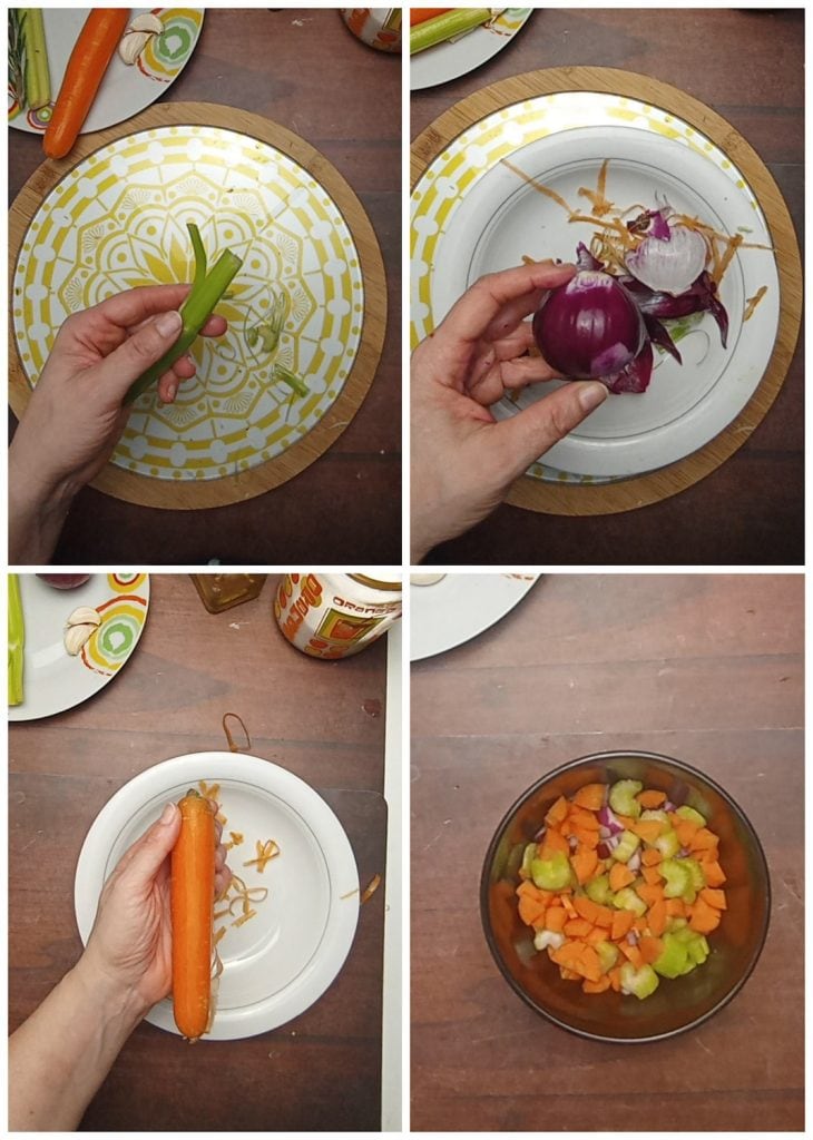 Maak ondertussen de groenten voor de soffritto klaar door de bleekselderij, de wortel en de ui te schillen.