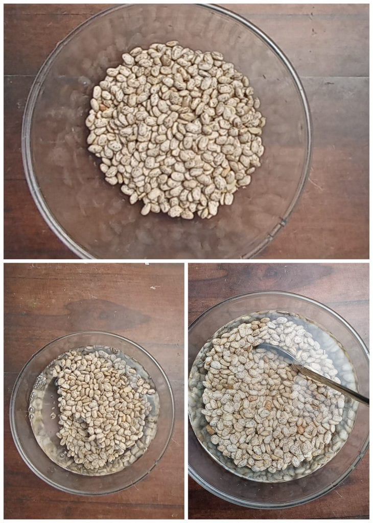 Om de Borlotto bonensoep te maken, week je als eerste de gedroogde bonen een hele nacht of ten minste zes uur in een kom volledig bedekt met water.