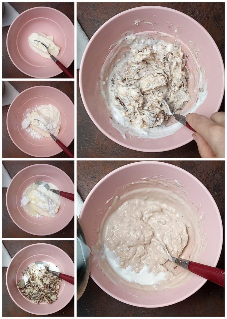 Nu gaan we verder met de room. In een kom mengen we de smeerkaas met de resterende wafels, grof verkruimeld (houd er een paar apart voor de uiteindelijke decoratie als je dat wilt). Voeg de poedersuiker, de melk met de eetbare gelatine, de yoghurt en de gecondenseerde melk toe.