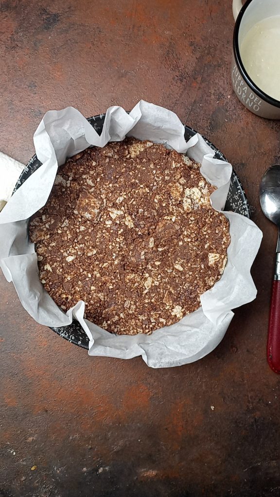 Voor de bodem van dit recept heb ik een vorm van 20 cm gebruikt, bedekt met een op maat geknipt bakpapier dat ook de randen bedekte.