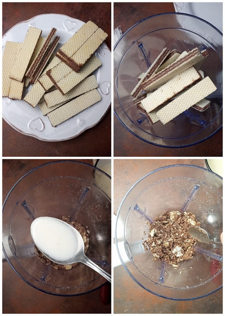 Ondertussen malen we 150 g van de 200 g wafels die voor het recept zijn voorzien en mengen we ze met twee eetlepels melk.