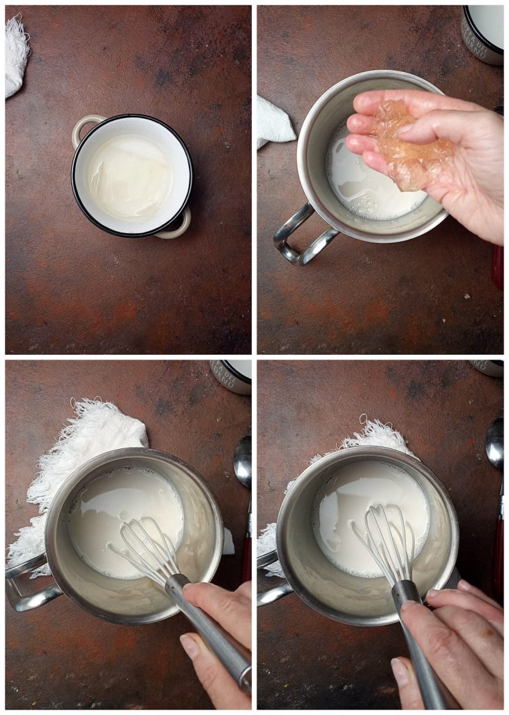 Knijp het uit en los het op in 75 ml melk, roer met een handgarde.