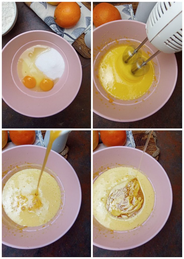 Voeg het citroensap, bij voorkeur versgeperst sinaasappelsap en zonnebloemolie toe.