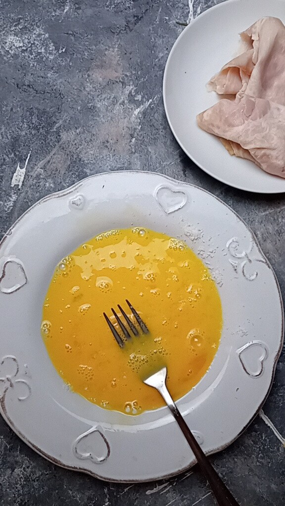 Voor de vulling heb ik dunne plakjes kalkoenborst gebruikt, maar je kunt ook andere vleeswaren naar keuze gebruiken.