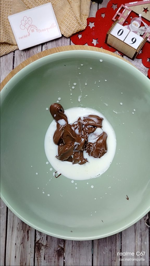 Bereid intussen de vulling voor. Giet de hazelnootcrème en de melk in een kom.