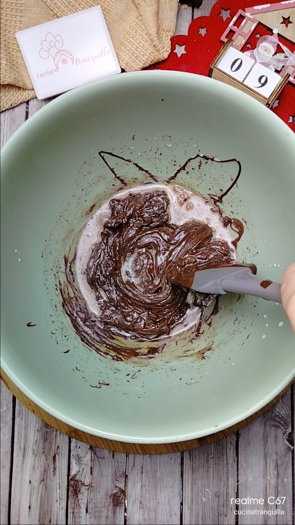 Voeg 70 g gesmolten chocolade toe. Roer snel met een spatel tot een soort crème ontstaat.
