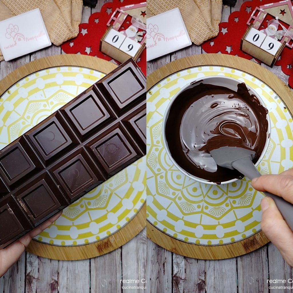 Om de Donkere chocoladenougat met gepofte spelt te maken, begin je met het smelten van de chocolade nadat je deze in stukken hebt gebroken, met de techniek die je verkiest. Ik koos ervoor om het in de magnetron te doen op 80w gedurende 3 minuten. Zodra het klaar is, meng je het met een spatel voor een paar seconden