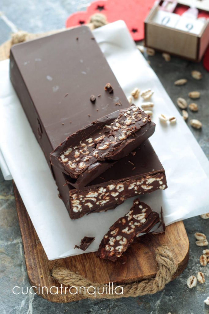 Donkere chocoladenougat met gepofte spelt, een eenvoudig idee en perfect als cadeau. Het is in slechts een paar stappen te maken en vereist minimale kooktijd, namelijk het smelten van de chocolade dat kan worden gedaan in de magnetron zoals in mijn recept of au bain-marie. Om de nougat te maken, gebruikte ik een zachte siliconen mal die het gebruik van bakpapier onnodig maakt. De grootte van de mal is 24 cm bij 10 (bedoeld als inhoud, wat voor ons van belang is). Hoe kwam ik op dit idee? Simpelweg omdat bijna alle nougats in de winkel amandelen bevatten en ik, helaas, allergisch ben voor dit type noten, dus besloot ik mijn eigen eenvoudige en heerlijke versie te maken met een hart van hazelnootcrème en spelt. In de beschrijving vindt u alle nauwkeurigheid van de gewichten die nodig zijn om mijn nougat te maken, hieronder laat ik u andere kerstlekkernijen zien, terwijl ik aan het einde van het recept de meest voorkomende vragen zal beantwoorden.