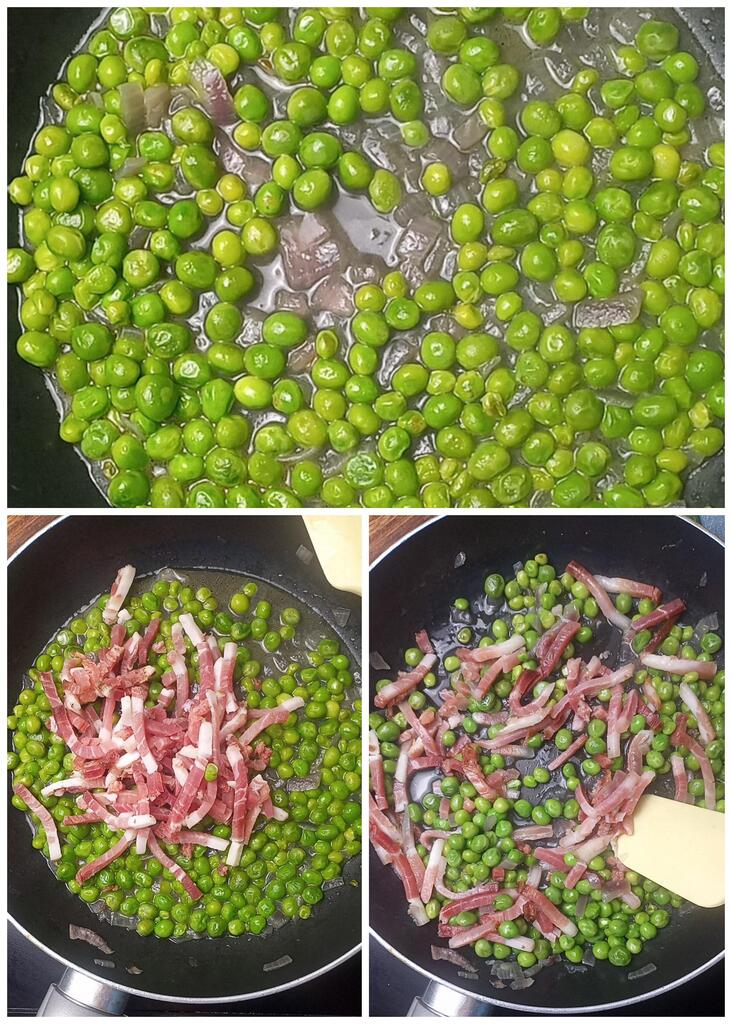 Voeg op dit punt de spek toe en kook nog 5 minuten op laag vuur, zodat de erwten smaak krijgen van het spekvet.