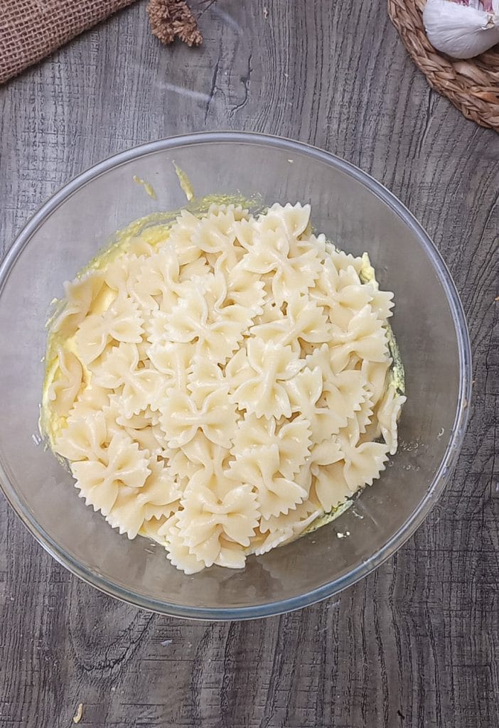Voeg de eerder uitgelekte pasta toe en meng goed.