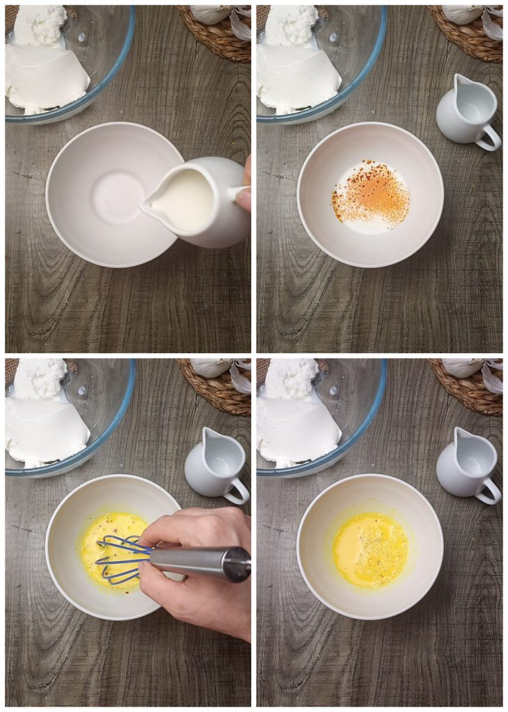 In een kleiner kommetje kun je de saffraan oplossen in de melk door snel te roeren, met een handgarde of een vork.