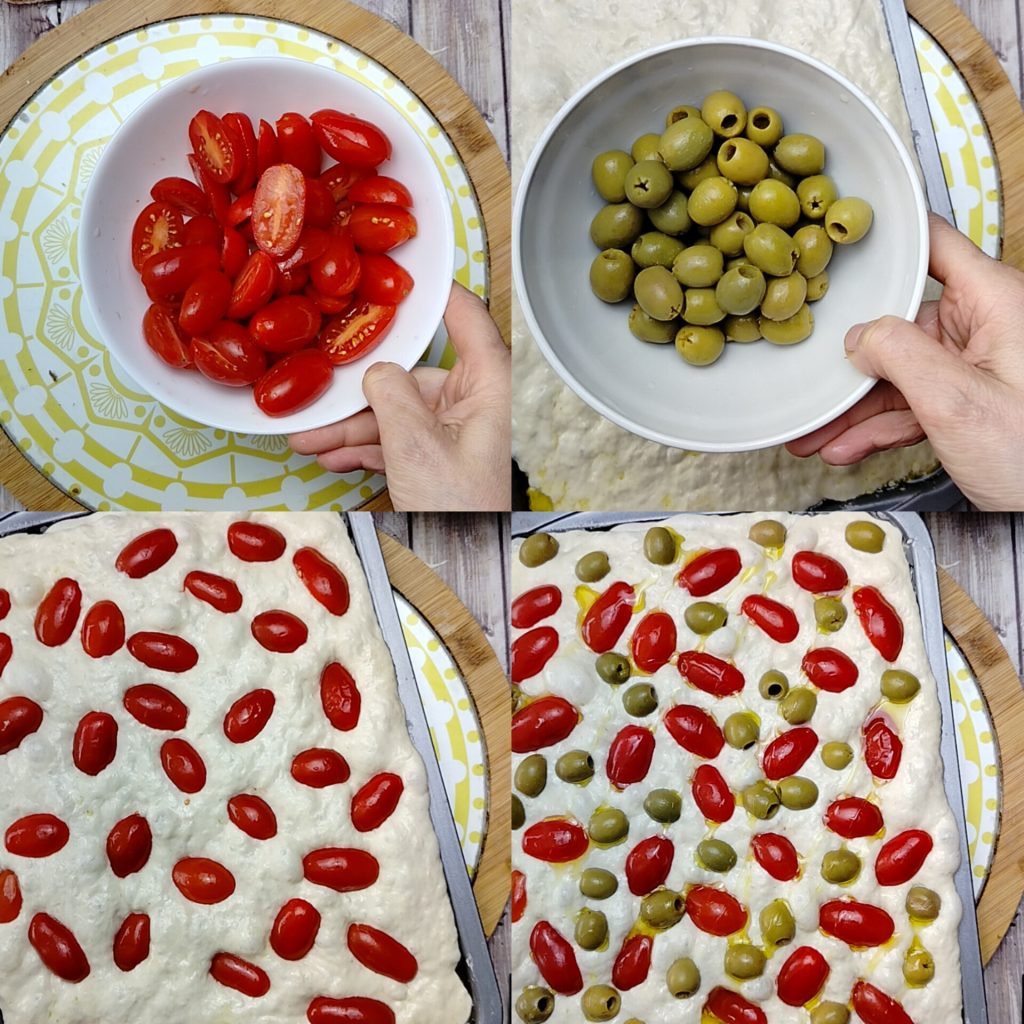 Laat rusten, nog steeds afgedekt, en was en snijd ondertussen de kerstomaatjes en laat de ontpitte olijven uitlekken en drogen. Verdeel ze over de pizza, besprenkel het oppervlak met nog een beetje olie en bak het 30 minuten op 200°C in de voorverwarmde heteluchtoven.