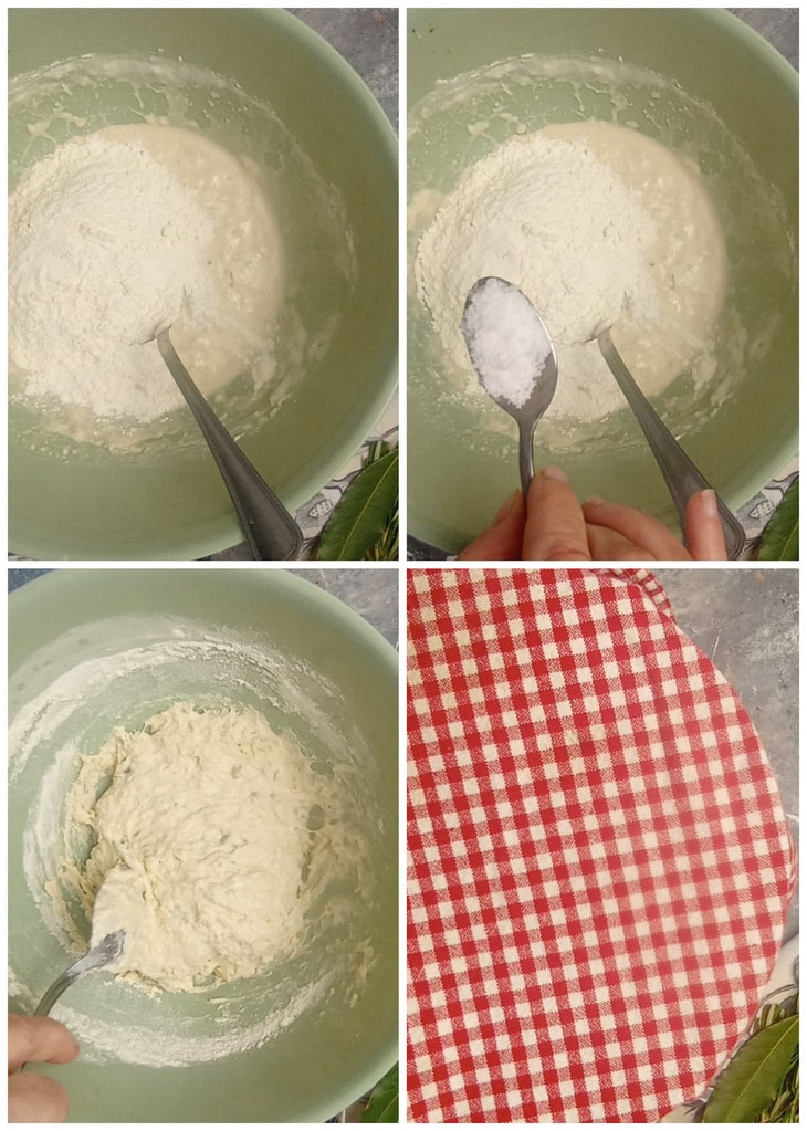 • Voeg de resterende bloem, het zout toe en bewerk het deeg opnieuw met een lepel.