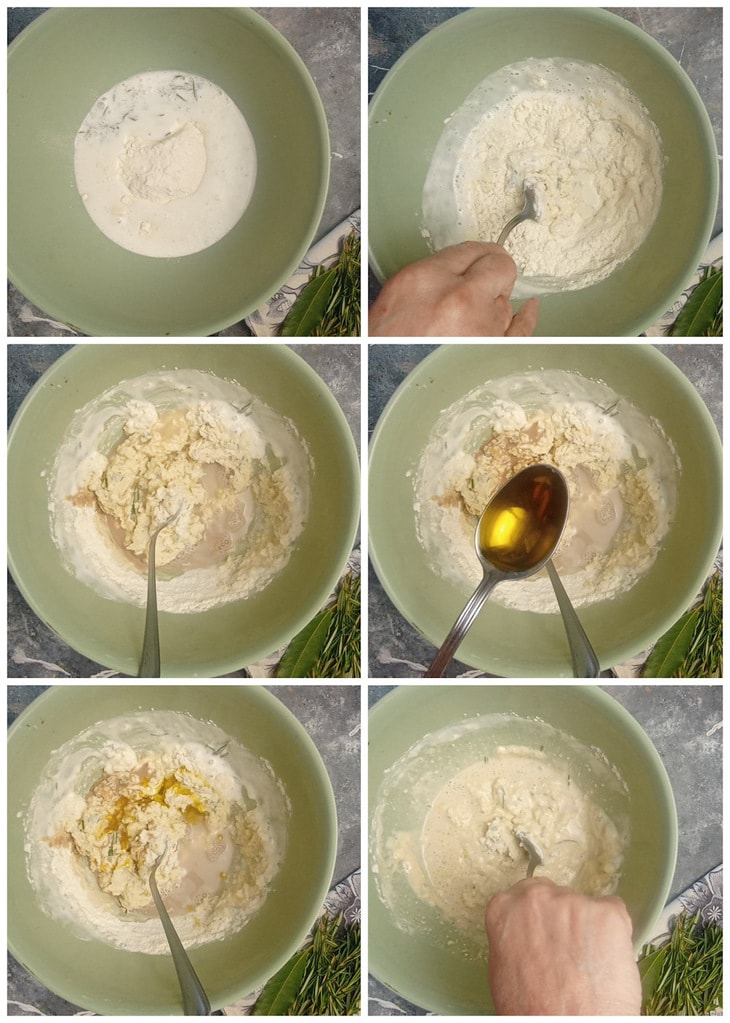 • Om de Focaccia met salie en rozemarijn met deeg in kom te maken, lossen we eerst de gist op in het lauwwarme water door het met een lepel te mengen.