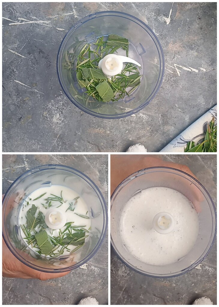 • Ondertussen doen we de steelloze en eerder gewassen en gedroogde aromatische kruiden in de blender en malen ze grof met de melk.