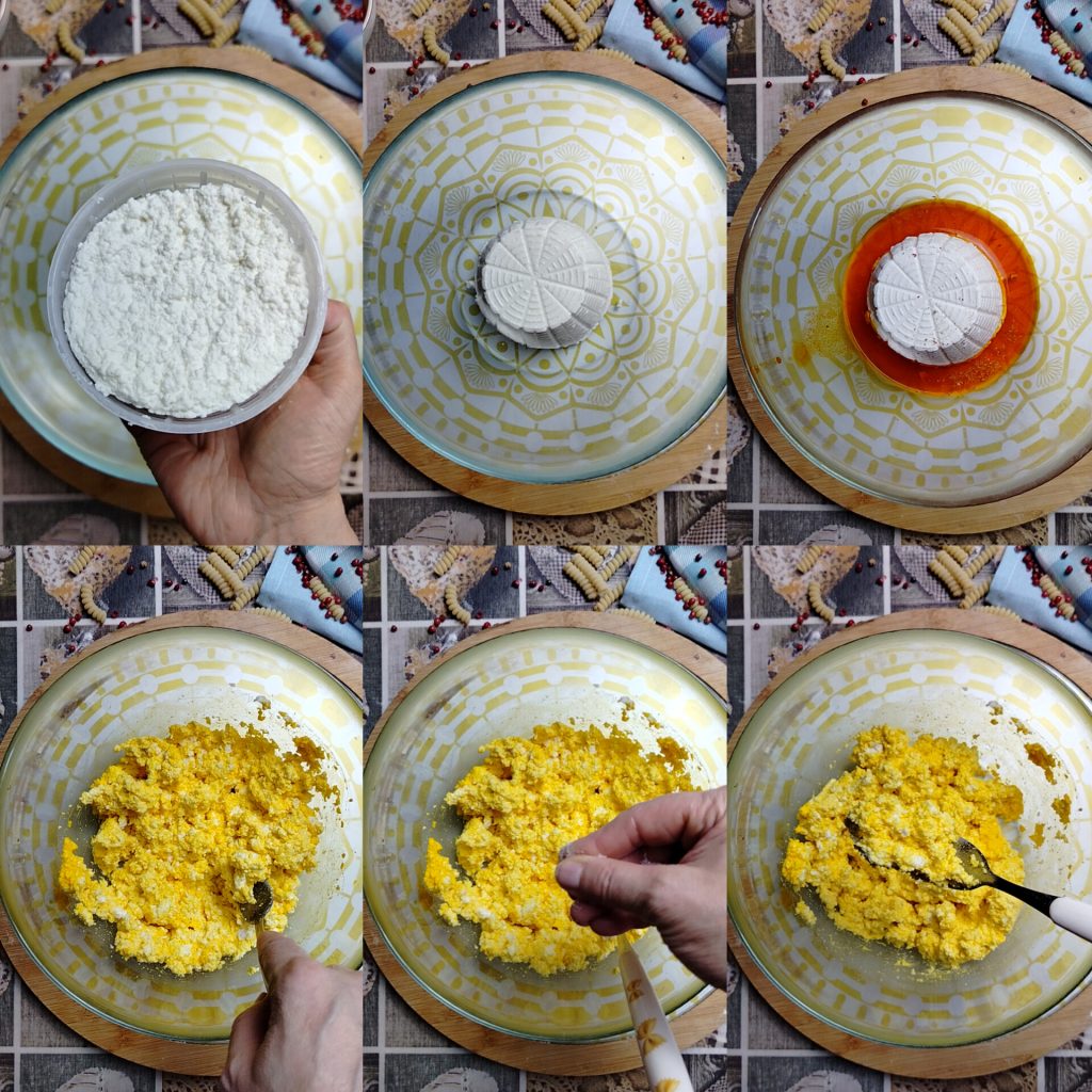 In een grote kom voeg je de goed uitgelekte ricotta, de opgeloste saffraan en een snufje peper toe. Meng de ingrediënten met een vork en voeg een snufje zout en een scheutje olie toe, terwijl je blijft roeren.