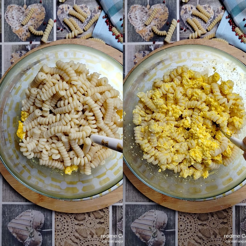 Kook intussen de pasta in ruim gezouten water en giet af. Voeg het toe aan de kom met de andere ingrediënten. Als je een romiger eindresultaat wilt bereiken, voeg dan een soeplepel warm water toe.