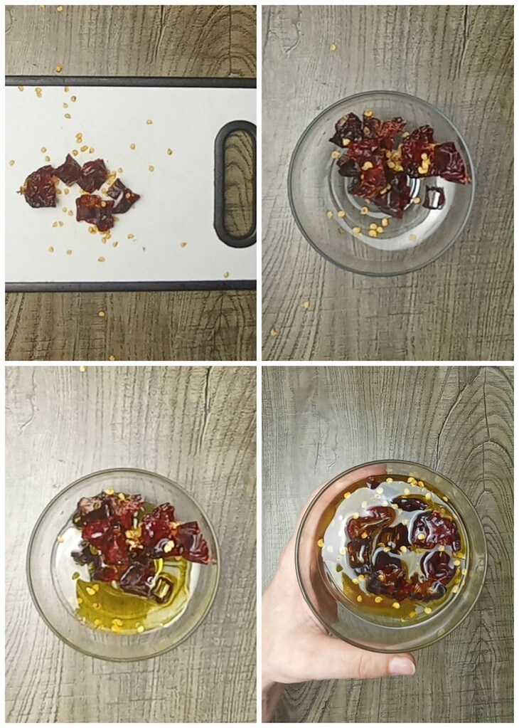 Verwijder intussen de steeltjes van de gedroogde paprika’s en snijd ze in stukjes of ringen.