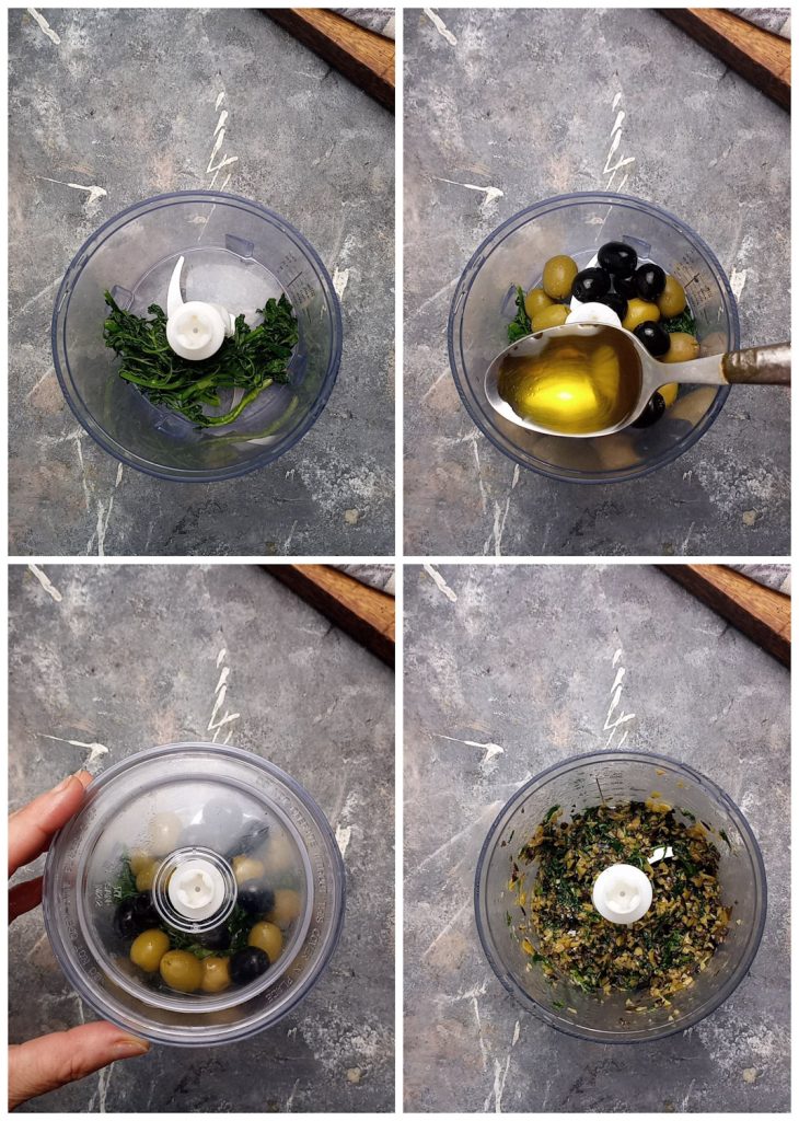• Intussen, in de kom van de mixer, doen we de eerder gewassen en gedroogde peterselie, de olijven (ik was ze even onder koud stromend water) en de olie.