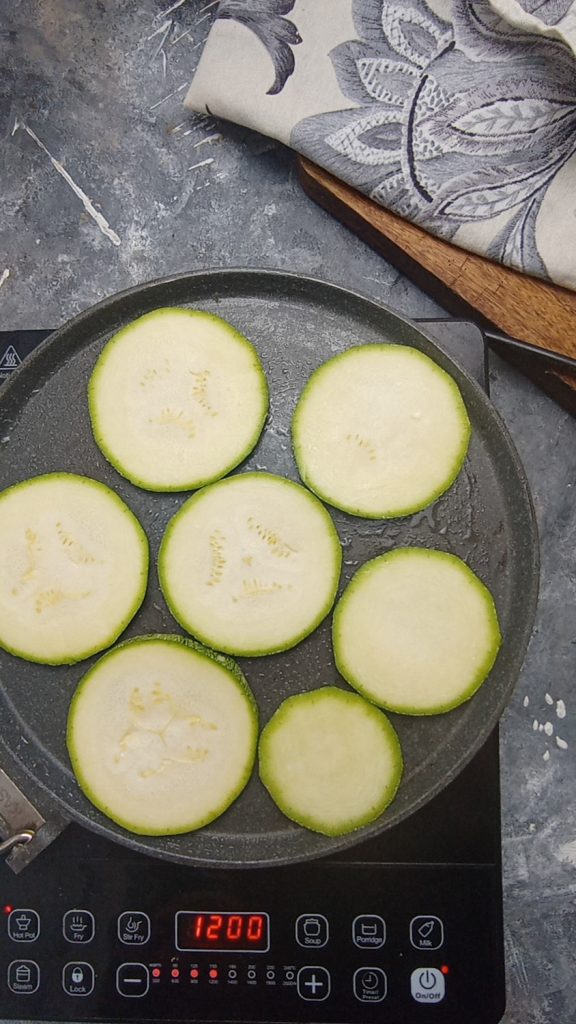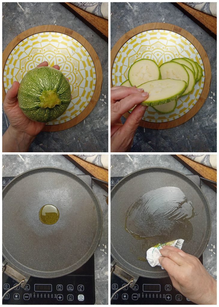 Vet een bakplaat lichtjes in, verwarm deze op gemiddelde temperatuur of op middelhoog vuur en leg de plakjes courgette zo neer dat je ze gemakkelijk kunt omdraaien en vooral zonder ze te overlappen.