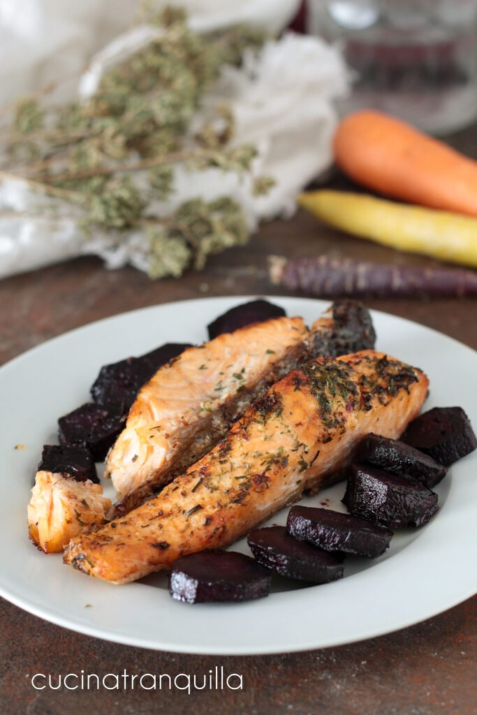 Je kunt de paarse wortels vervangen door de klassieke oranje of gele wortels. In plakjes gesneden, zullen ze in dezelfde tijd koken als de zalm.