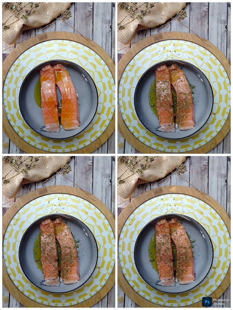 Om de gemarineerde zalm in een airfryer te bereiden, plaatsen we de in tweeën gesneden zalmfilet in een kom en bedruipen deze met twee eetlepels extra vergine olijfolie.