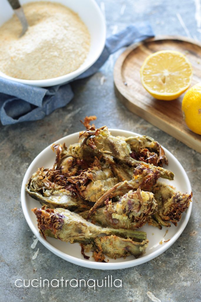 Voeg nog een beetje olie toe, verdeel de artisjokken goed door ze uit te spreiden en kook in de heteluchtfriteuse op 180° gedurende 12 minuten of totdat ze krokant van buiten maar zacht van binnen zijn.