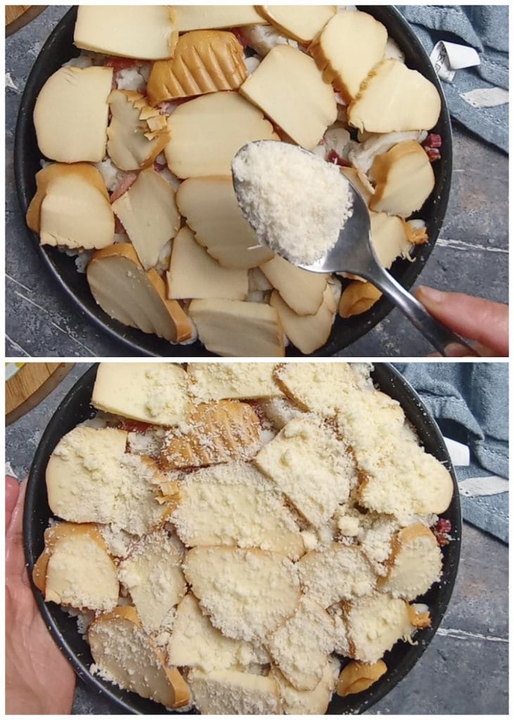 Je kunt de gerookte scamorza ook vervangen door de witte variant of dezelfde hoeveelheid in plakjes.