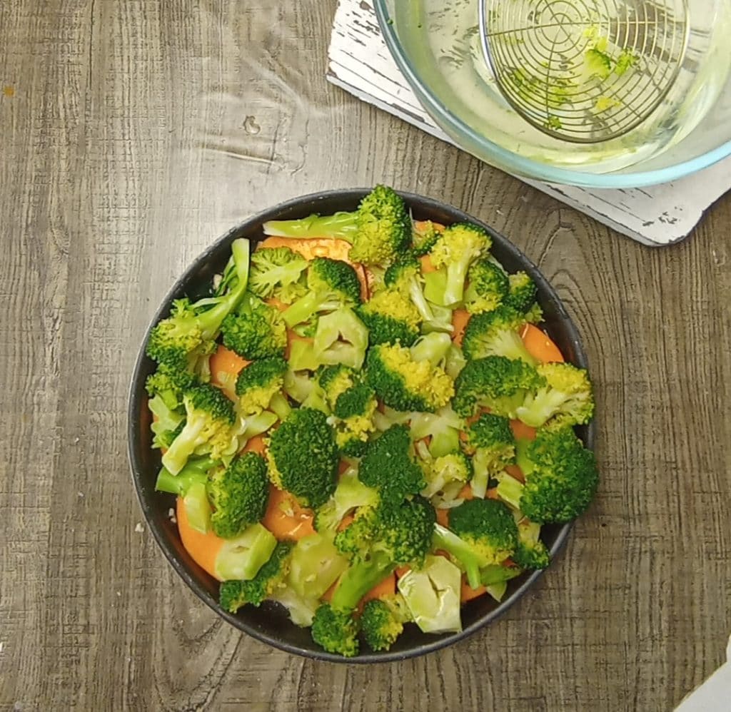 Wees niet bang voor de dubbele kookmethode, want het blancheren van de broccoli duurt slechts 5 minuten, een noodzakelijke stap om ze zacht te maken, zodat ze vervolgens mee kunnen gaaren in de oven met de pompoen.