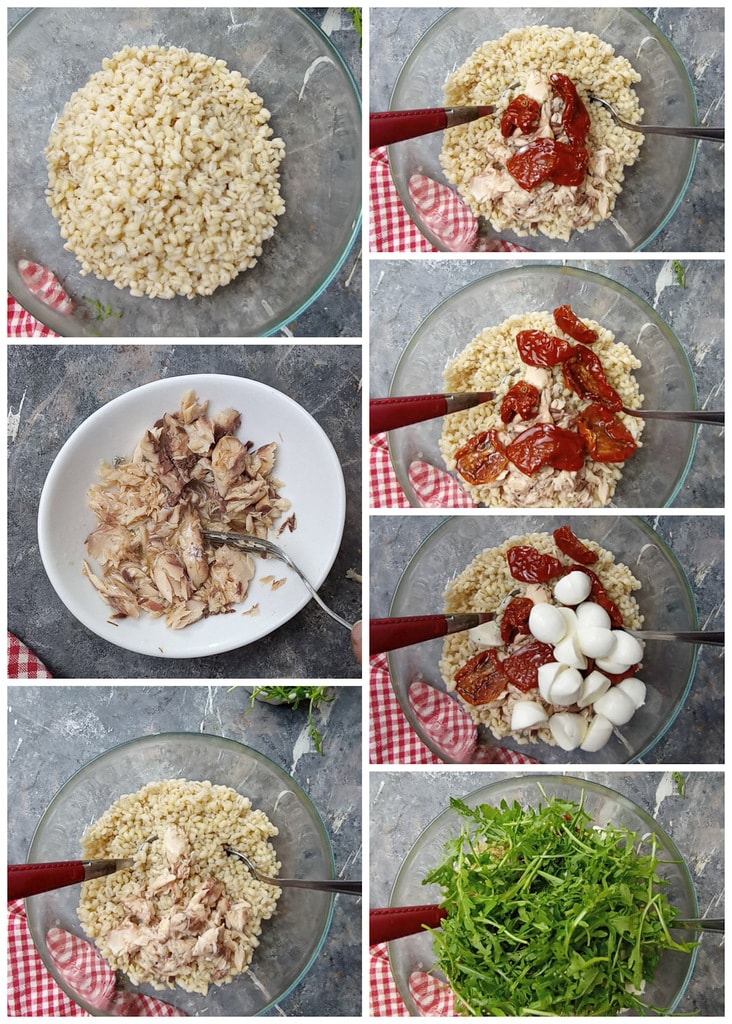 Om de Gerste salade met makreel en zongedroogde tomaten te maken, koken we eerst de gerst in ruim zout water, laten we het uitlekken en afkoelen in een kom met een scheutje olie.